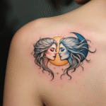 Tetování ženy, blíženci znamení zvěrokruhu na lopatce