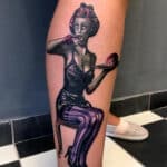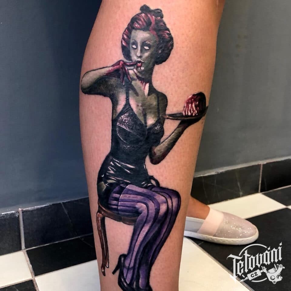 Tetování ženy, nadpřirozená bytost zombie, znaky a symboly na lýtko