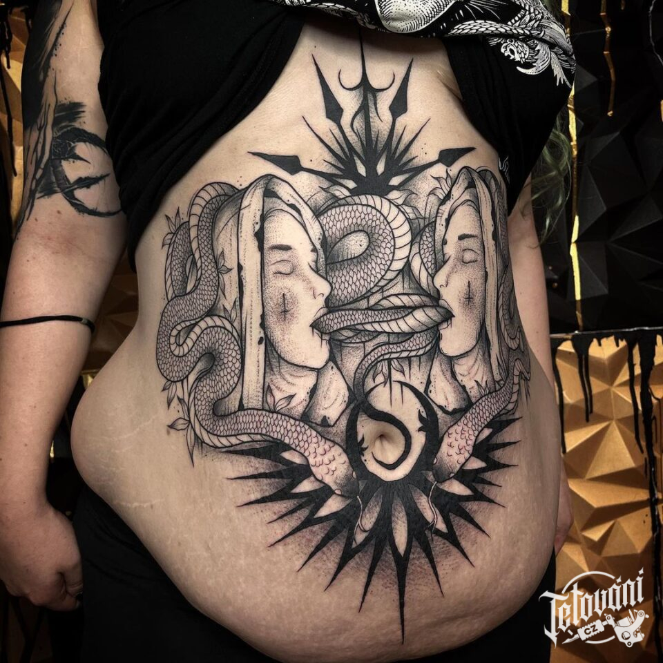 Tetování ženy, zvíře had, portrét na břicho