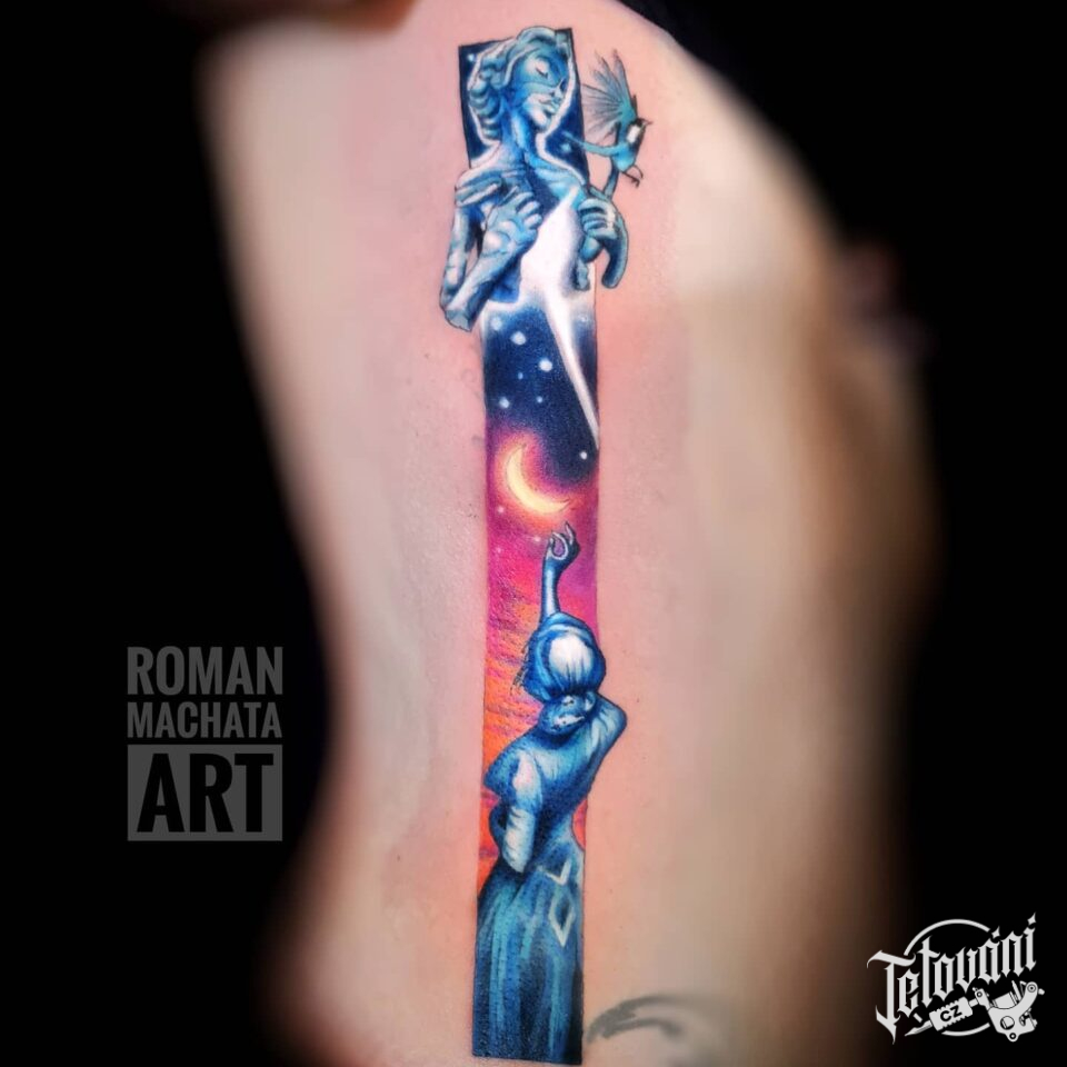 Tetování ženy, zvíře pták a měsíc na boku