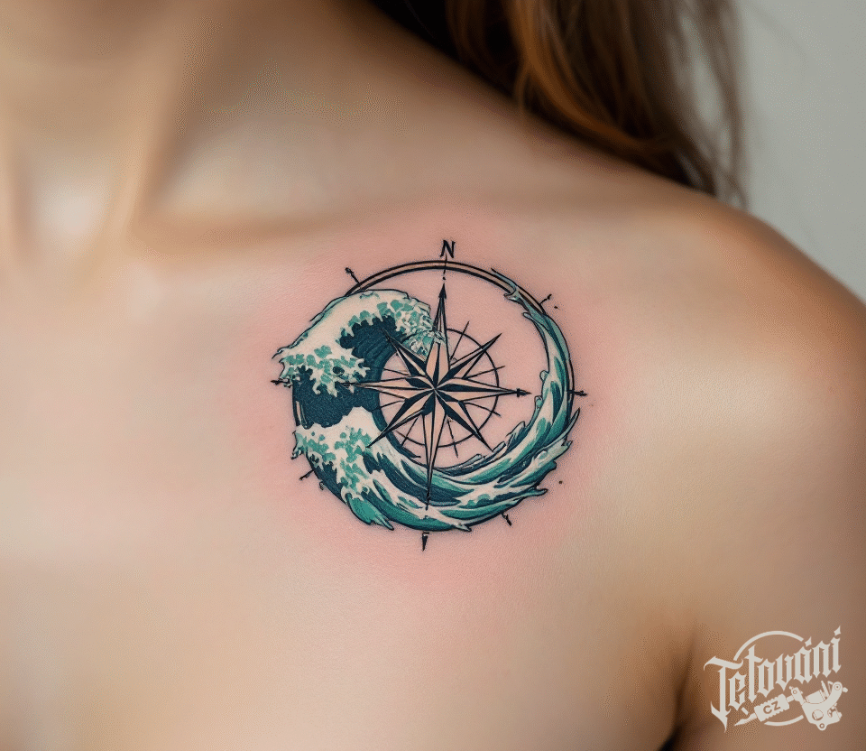 Tetování živel vlna, kompas pod klíční kost
