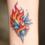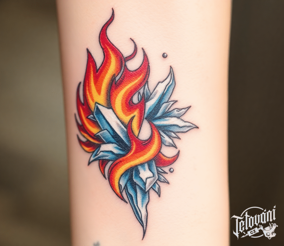 Tetování živly, oheň a voda, dobro a zlo na předloktí
