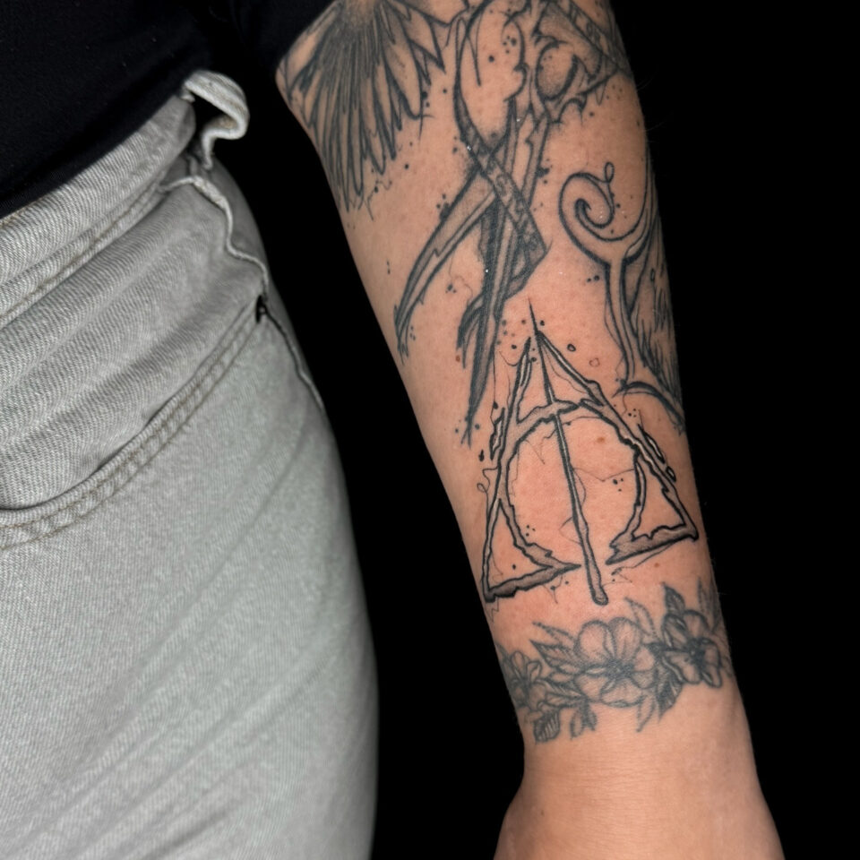 Tetování znak relikvie smrti z filmů a pohádek Harry Potter na předloktí