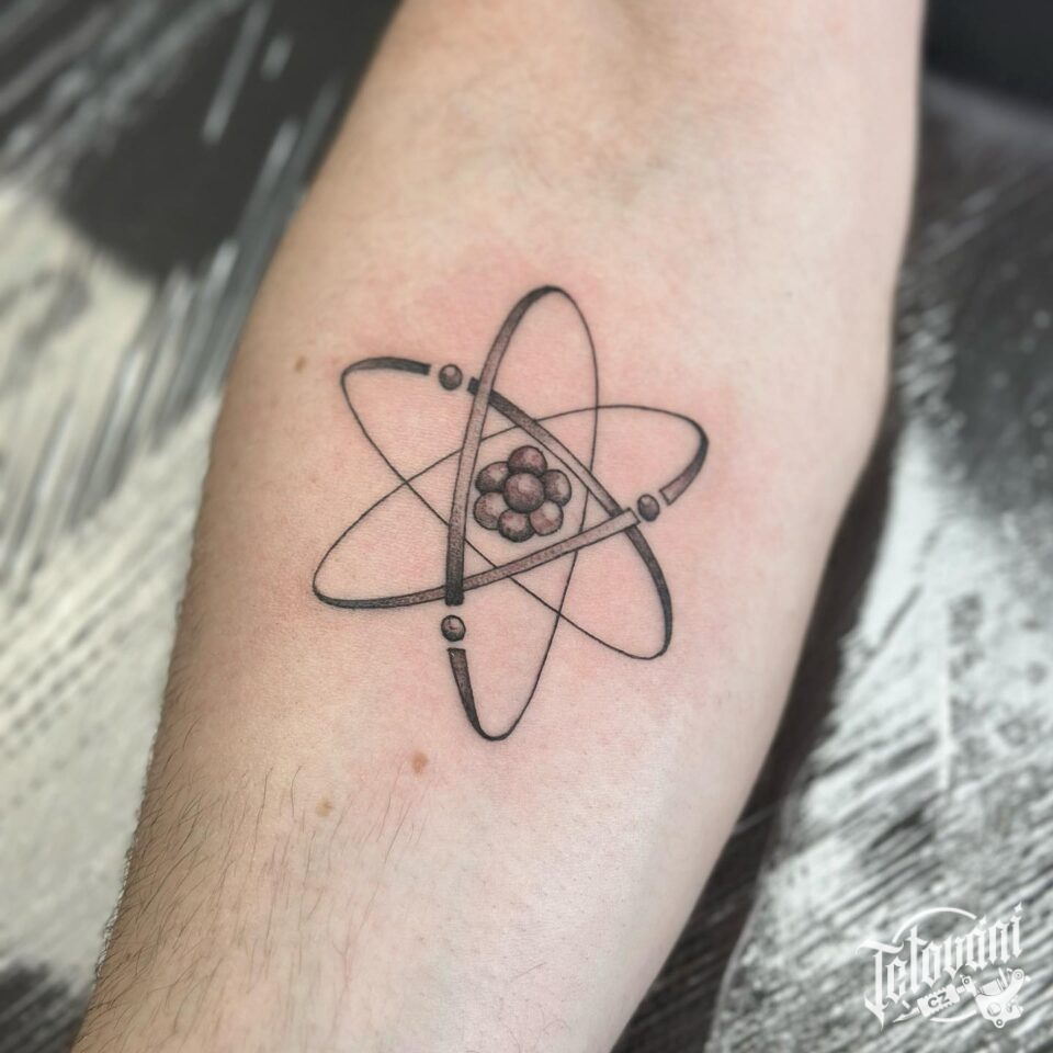Tetování znaky a symboly, atomy, protony, molekuly na předloktí