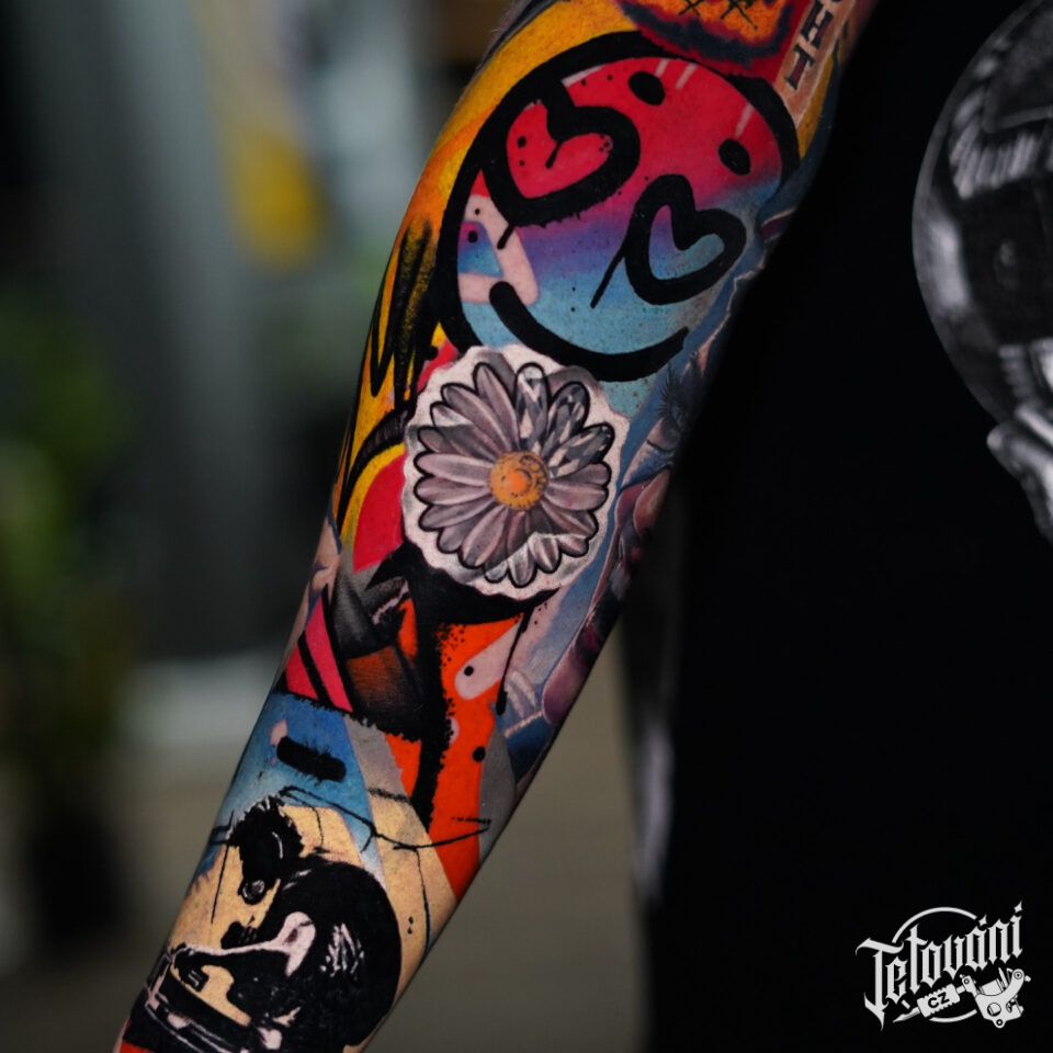 Tetování znaky a symboly, čáry, nápisy, květina, rukáv