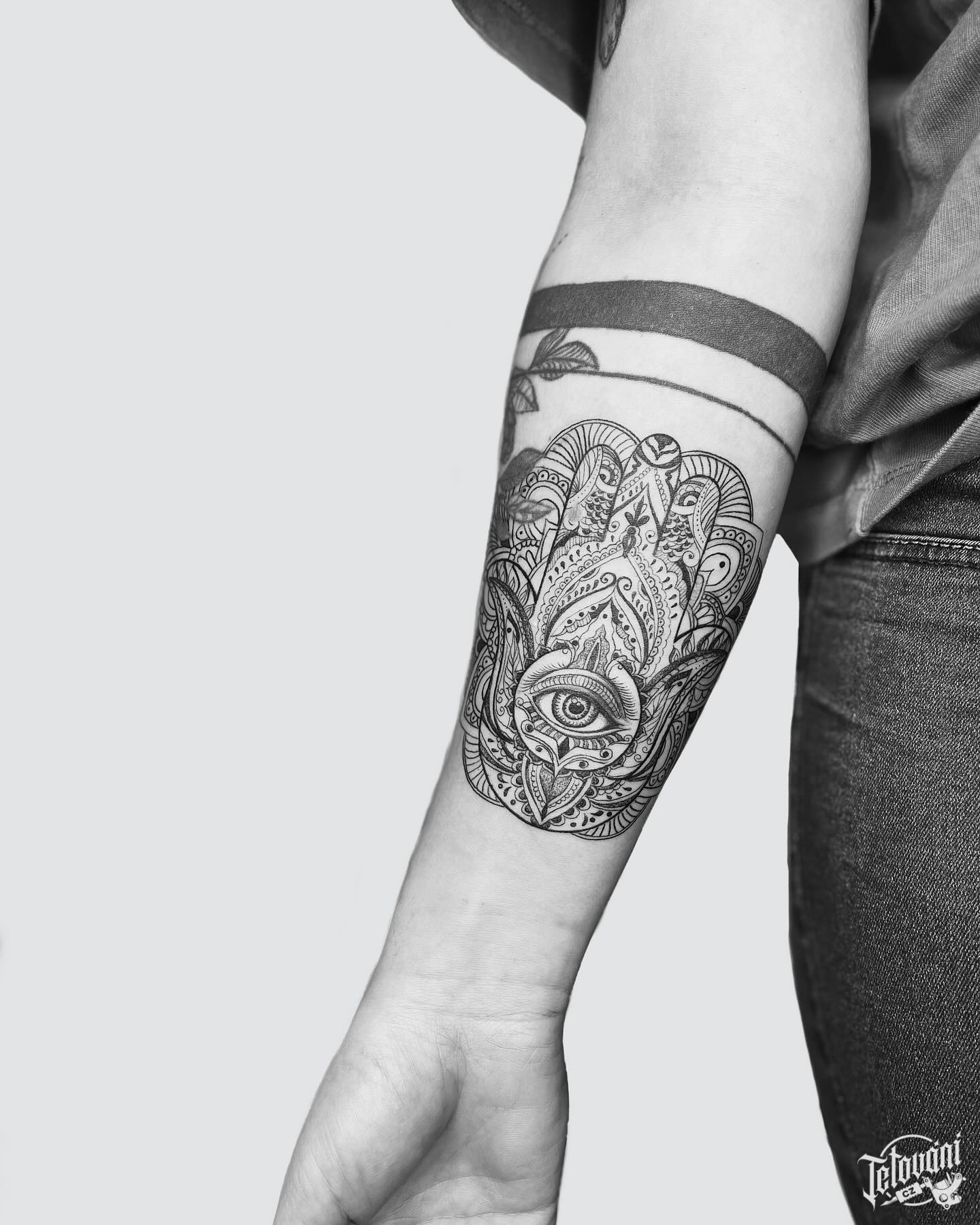 Tetování znaky a symboly, černá hamsa na rameni