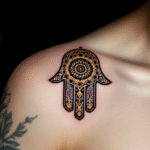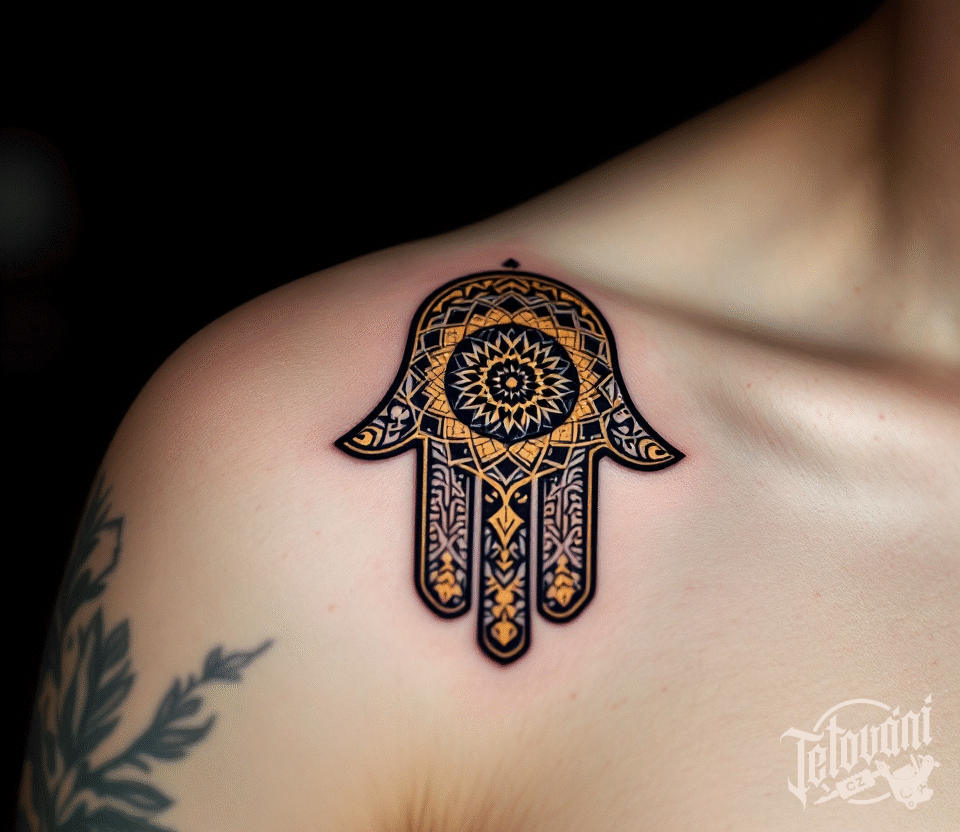 Tetování znaky a symboly, černo žlutá hamsa s ornamenty na klíční kosti