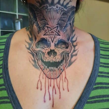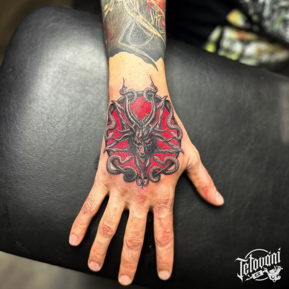 Tetování znaky a symboly, ďábel s pentagramem na hřbetu ruky