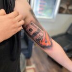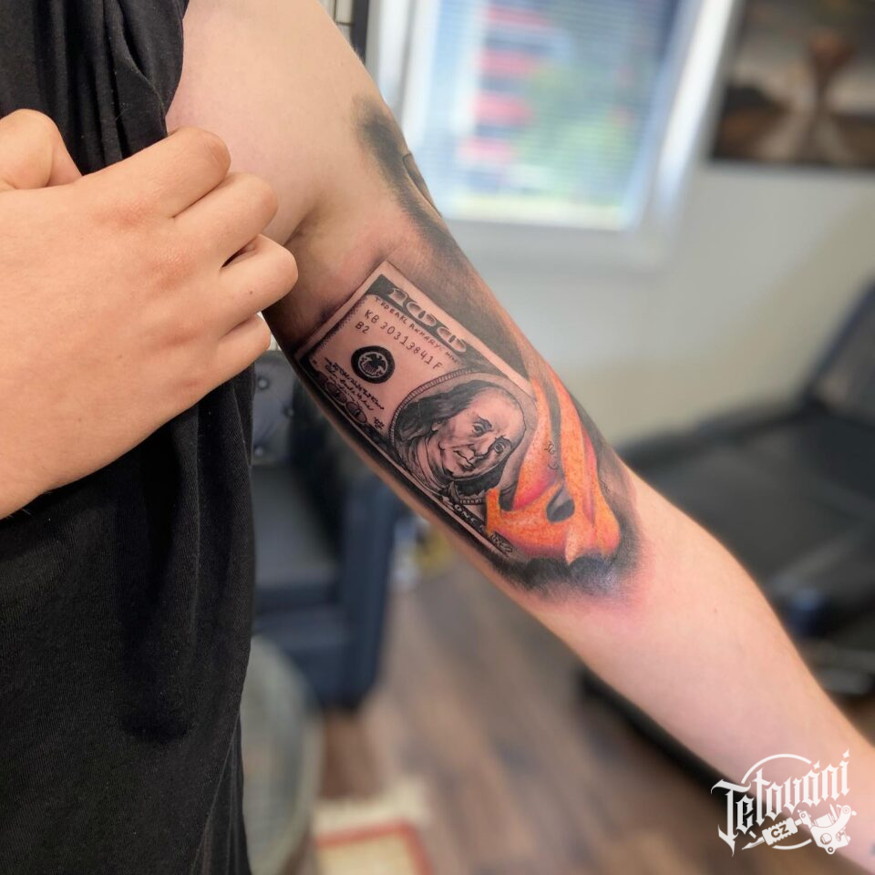 Tetování znaky a symboly dolar a živel oheň na paži