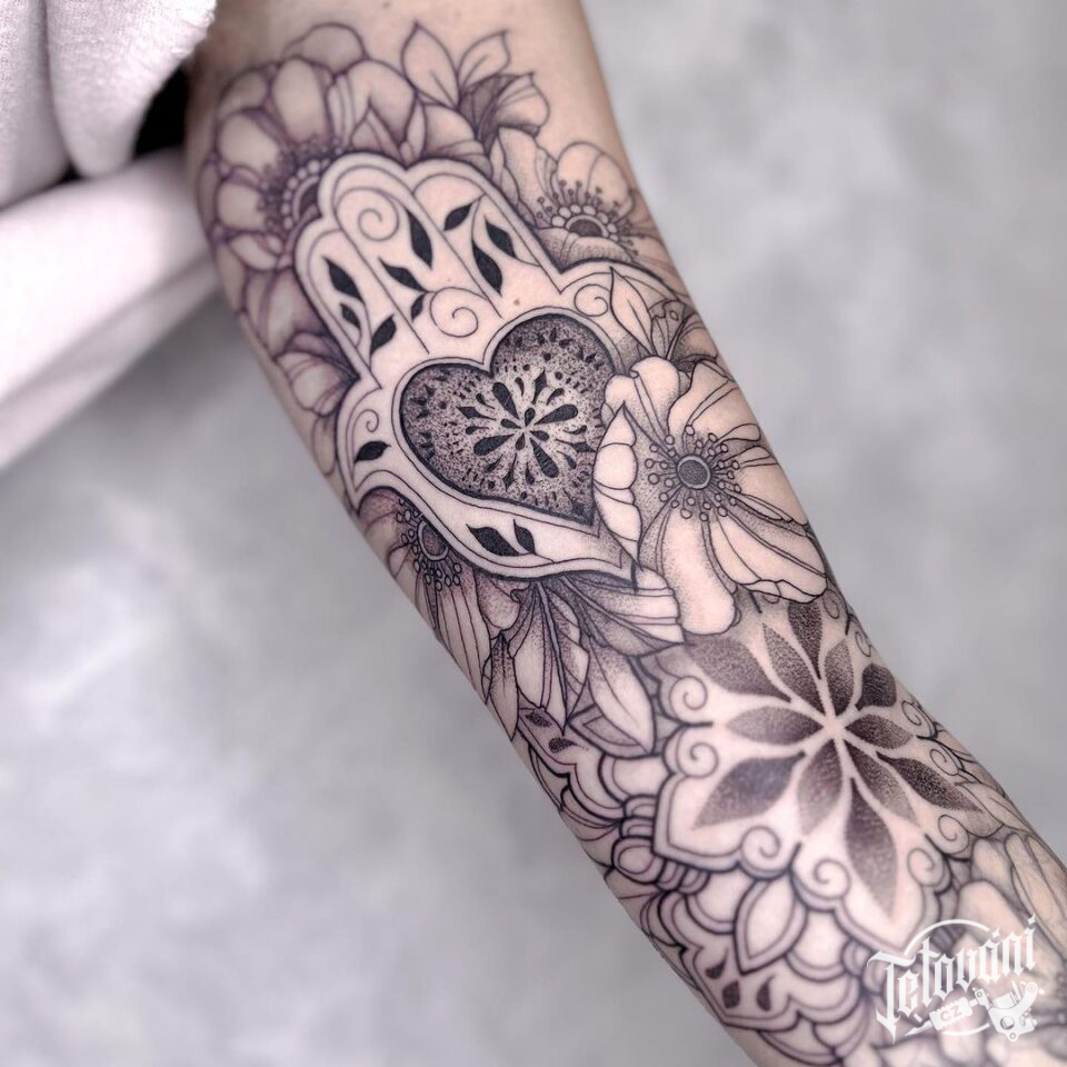 Tetování znaky a symboly, hamsa, květiny a mandaly na ruce