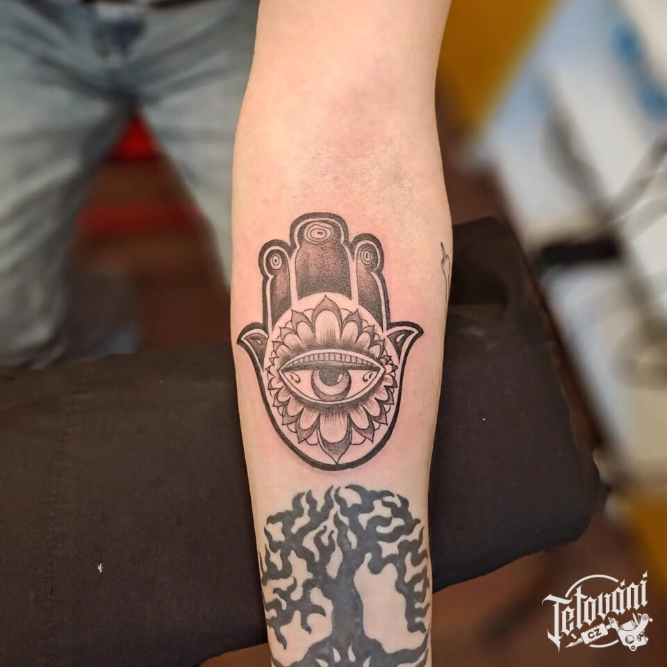 Tetování znaky a symboly Hamsa na předloktí