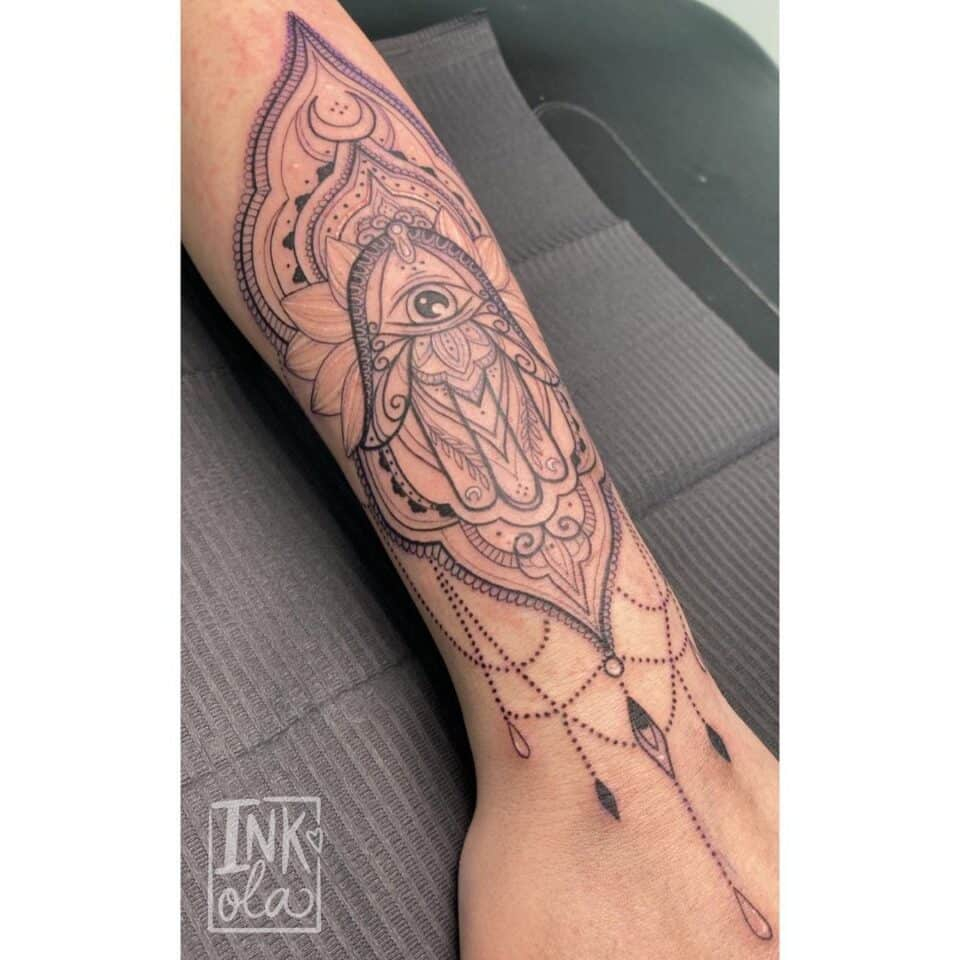 Tetování znaky a symboly Hamsa, oko na předloktí