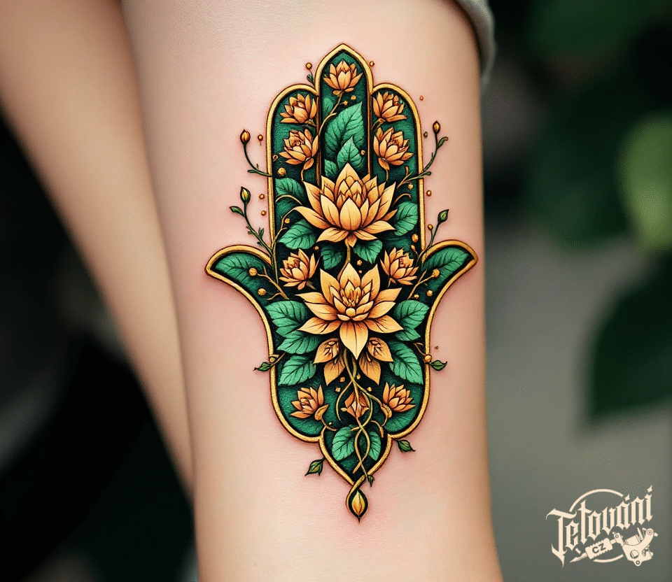 Tetování znaky a symboly, hamsa s květinami lotos na ruce