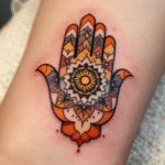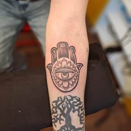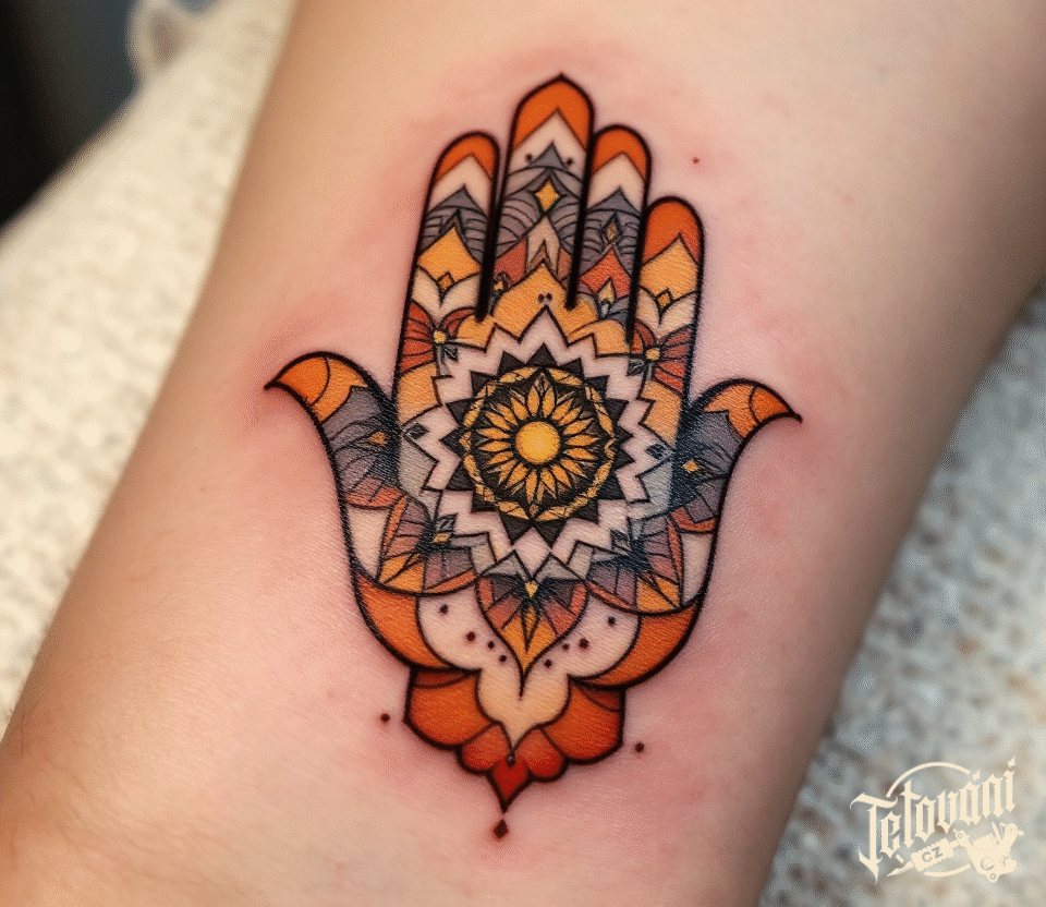 Tetování znaky a symboly, hamsa se Sluncem na předloktí