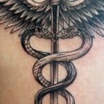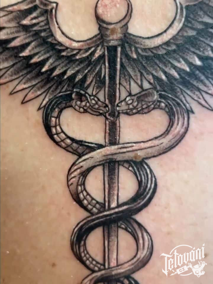 Tetování znaky a symboly, hermova hůl a hadi na rameni