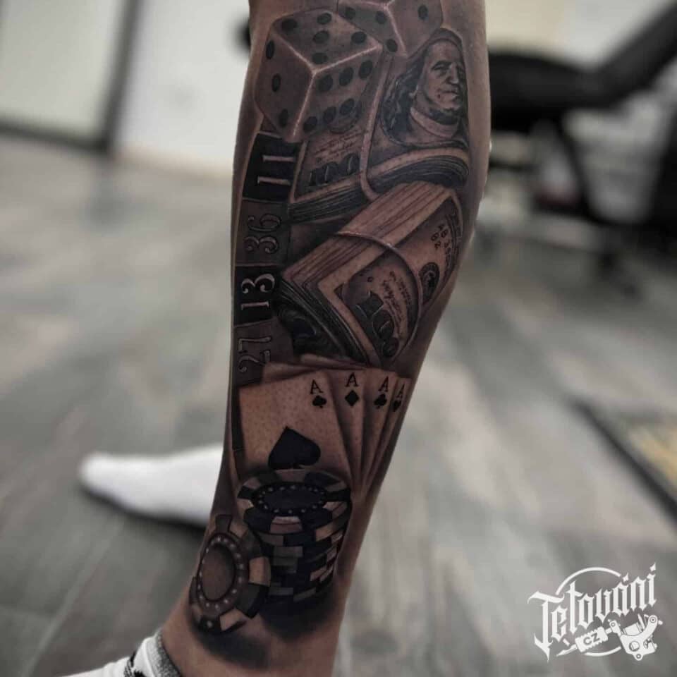 Tetování znaky a symboly, hrací karty a kostky na lýtko