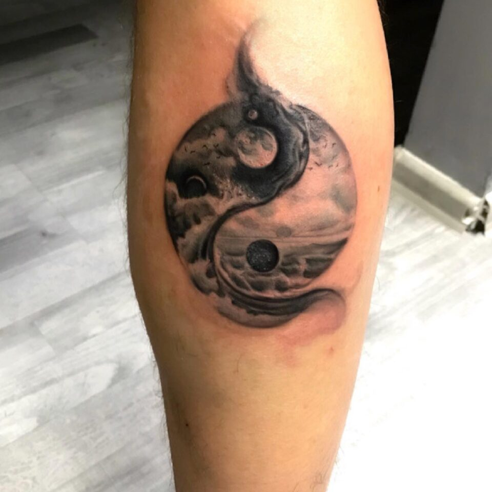 Tetování znaky a symboly, jin a jang na lýtku