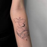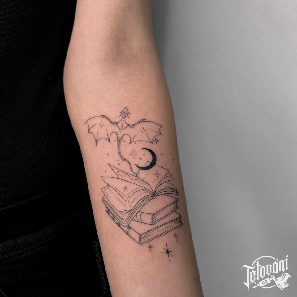 Tetování znaky a symboly, kniha a mýtické bytosti, drak na předloktí