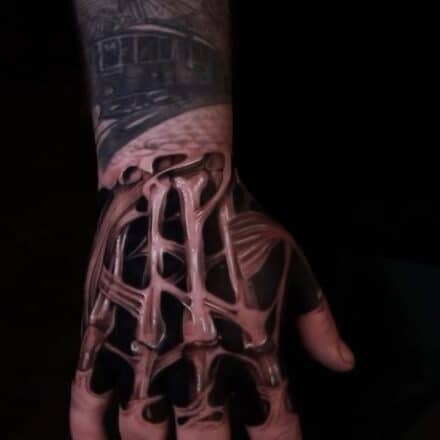 Tetování znaky a symboly, kostlivec, ruka, karty na noze