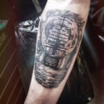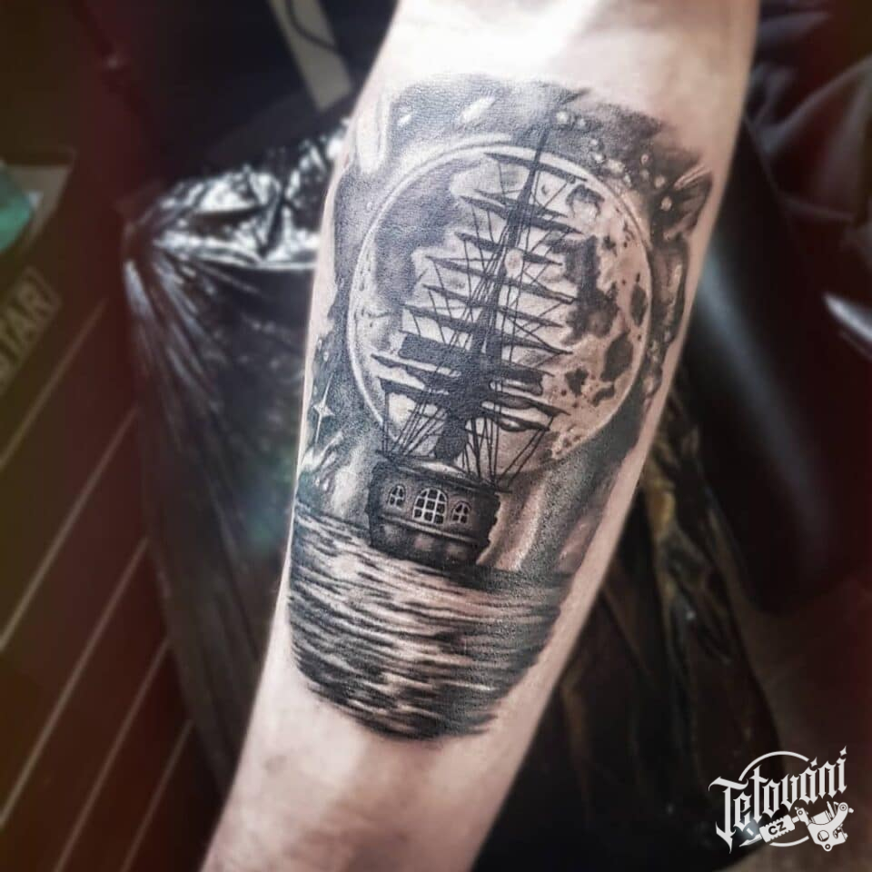 Tetování znaky a symboly, loď, příroda, moře a měsíc na předloktí