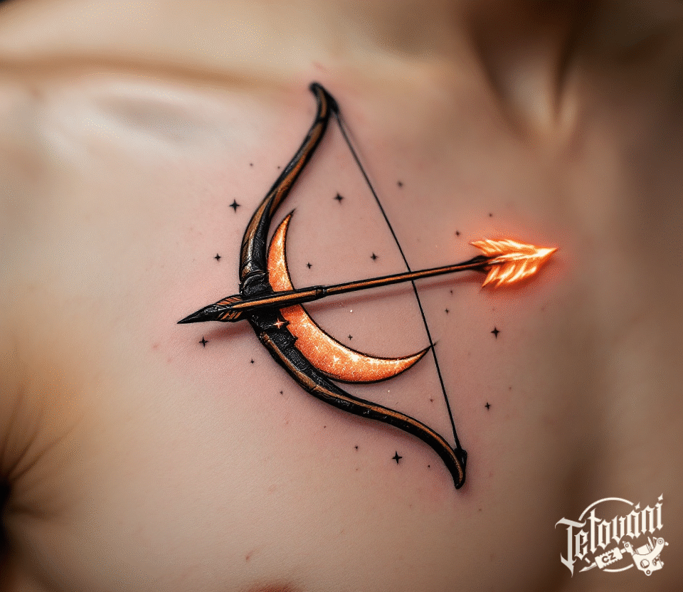 Tetování znaky a symboly, luk a šíp, měsíc a znamení zvěrokruhu, střelec na prsa