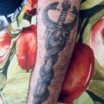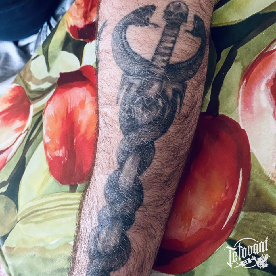 Tetování znaky a symboly, meč s hady, symbol zdraví na předloktí