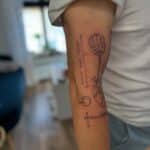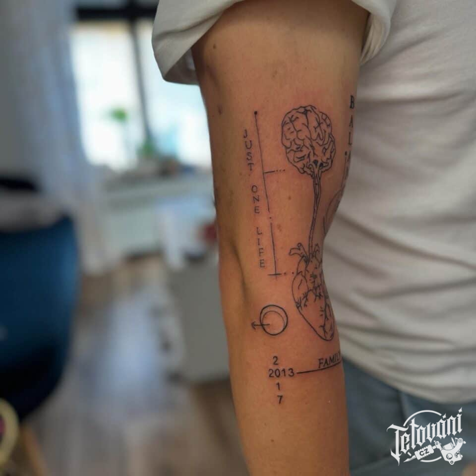 Tetování znaky a symboly, mozek, srdce, nápisy a čísla na rukáv