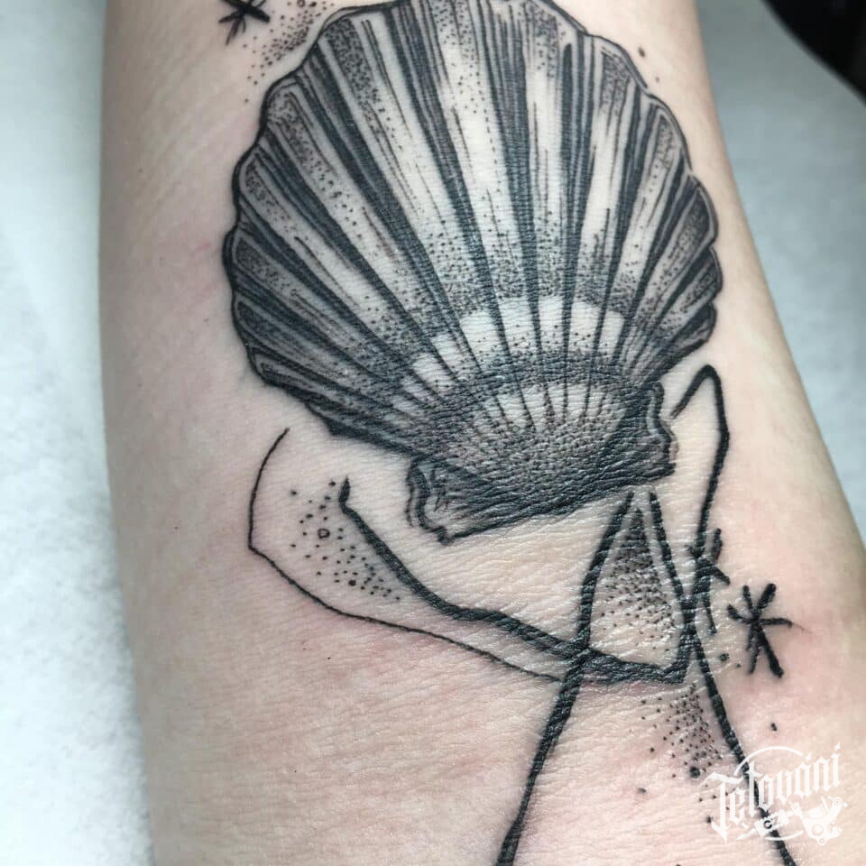 Tetování znaky a symboly, mušle a abstraktní čáry na předloktí