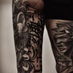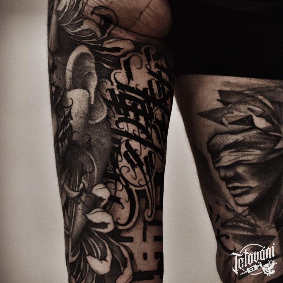 Tetování znaky a symboly, nápis na stehnu