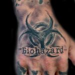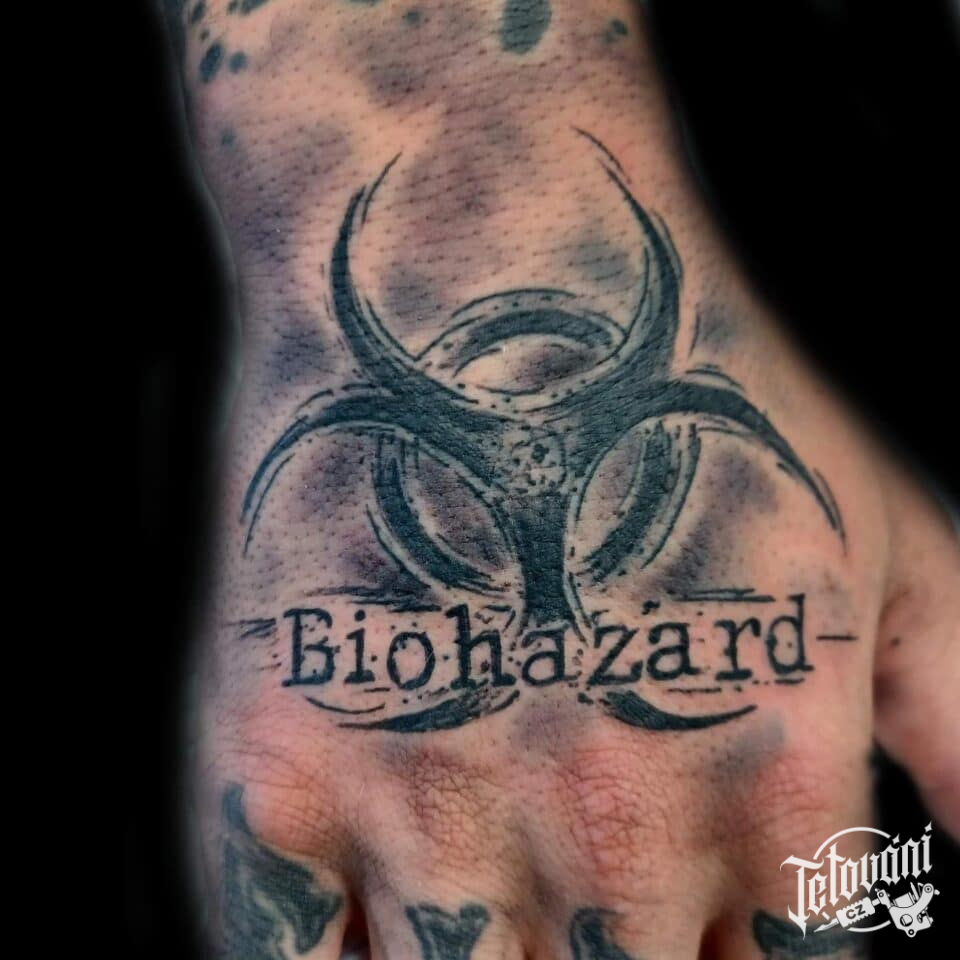 Tetování znaky a symboly, nápis, symbol Biohazard na hřbetu ruky