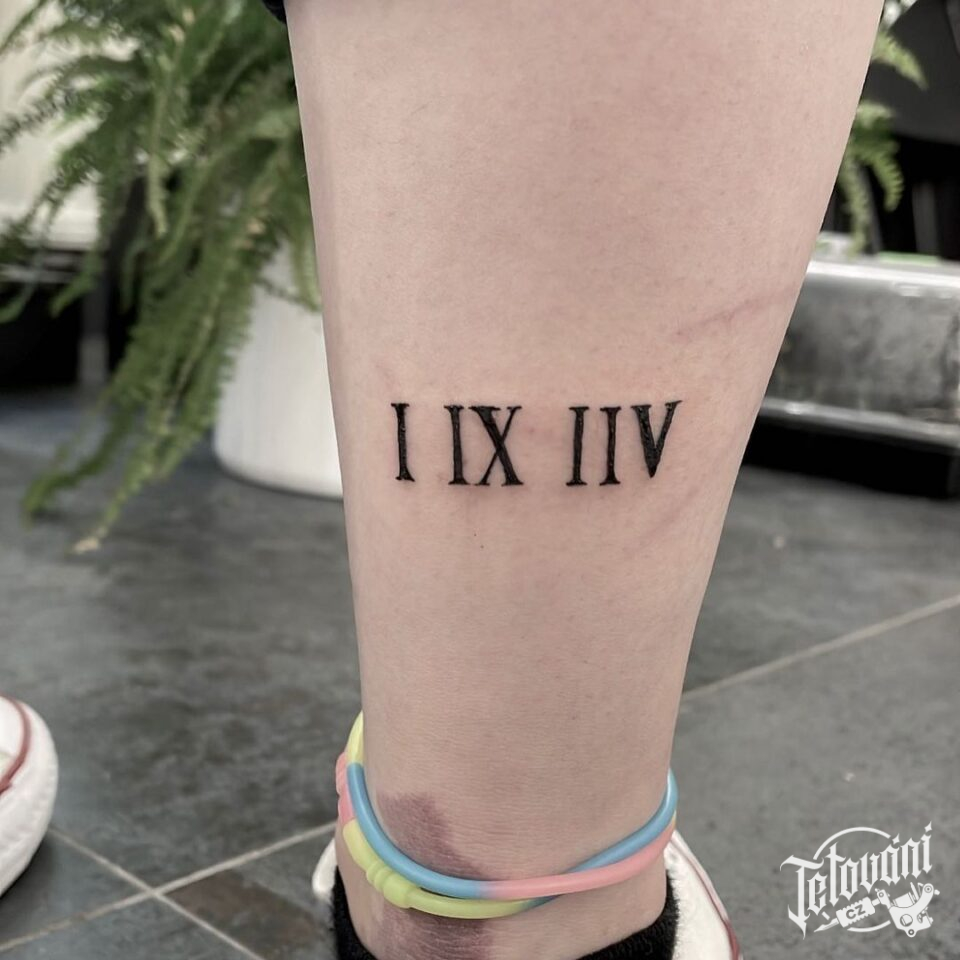 Tetování znaky a symboly, nápisy, čísla, písmena, na lýtko