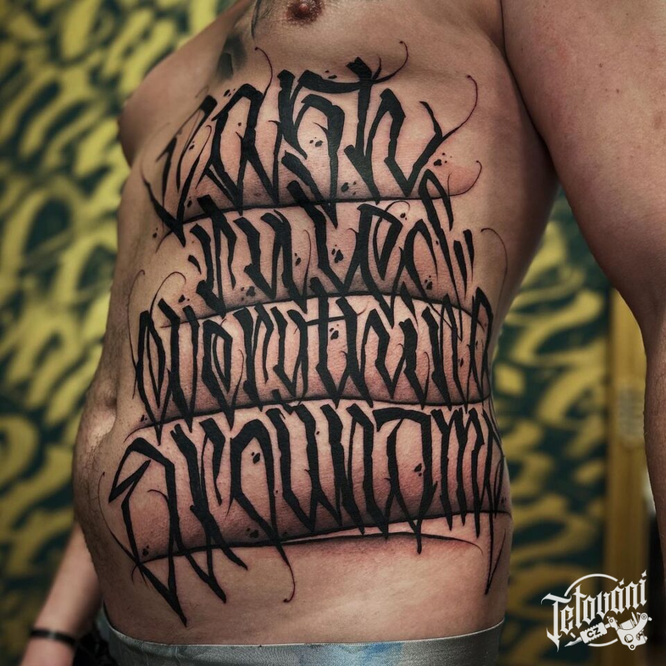 Tetování znaky a symboly, nápisy, písmena na břicho a žebra