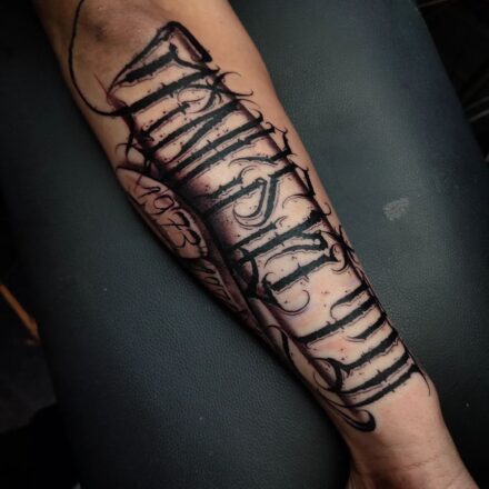 Tetování znaky a symboly, nápisy, písmena na lýtko