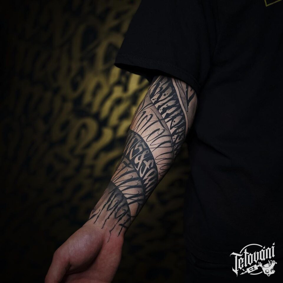 Tetování znaky a symboly, nápisy, písmena na předloktí