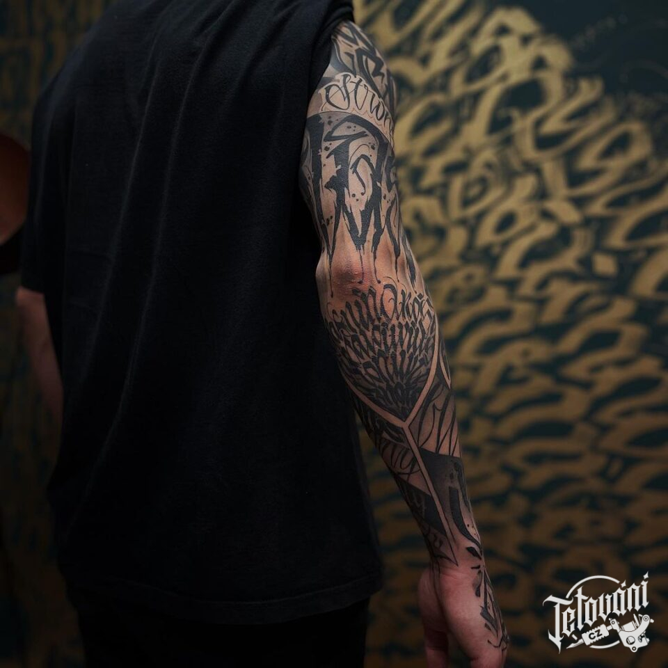 Tetování znaky a symboly, nápisy, písmena, rukáv