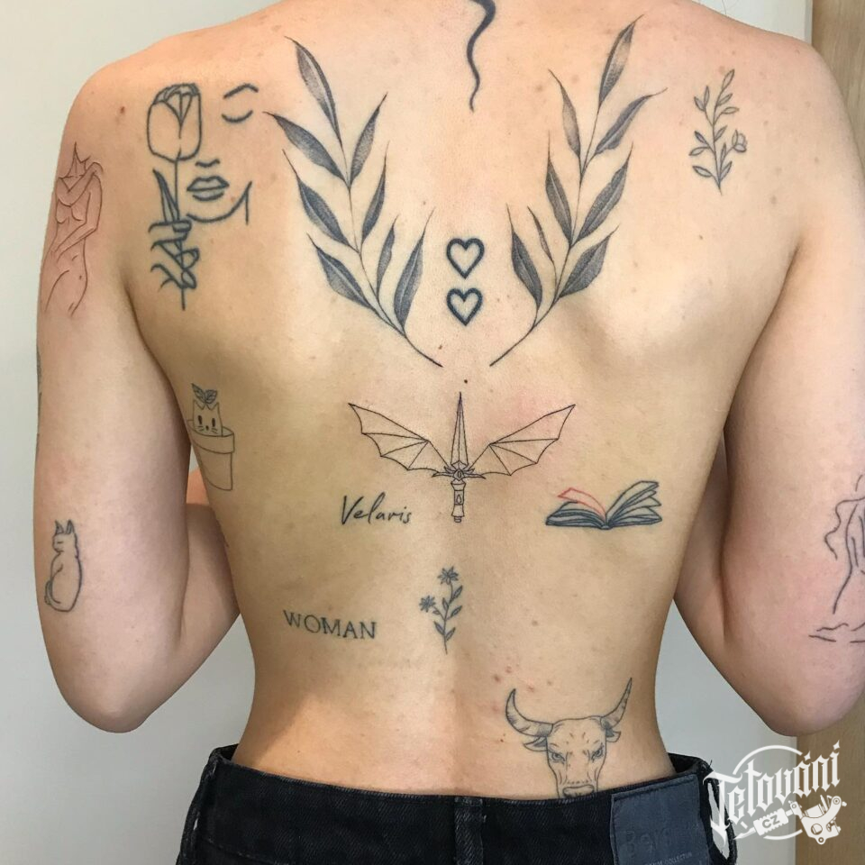 Tetování znaky a symboly, nápisy, větvičky na zádech