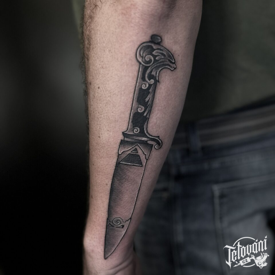 Tetování znaky a symboly nůž na předloktí