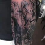 Tetování znaky a symboly, nůž, nápis, motýl a hodiny na rukávu