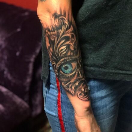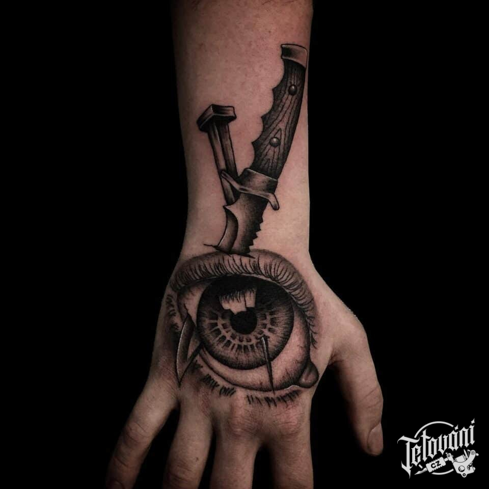 Tetování znaky a symboly, oko s nožem na hřbet ruky