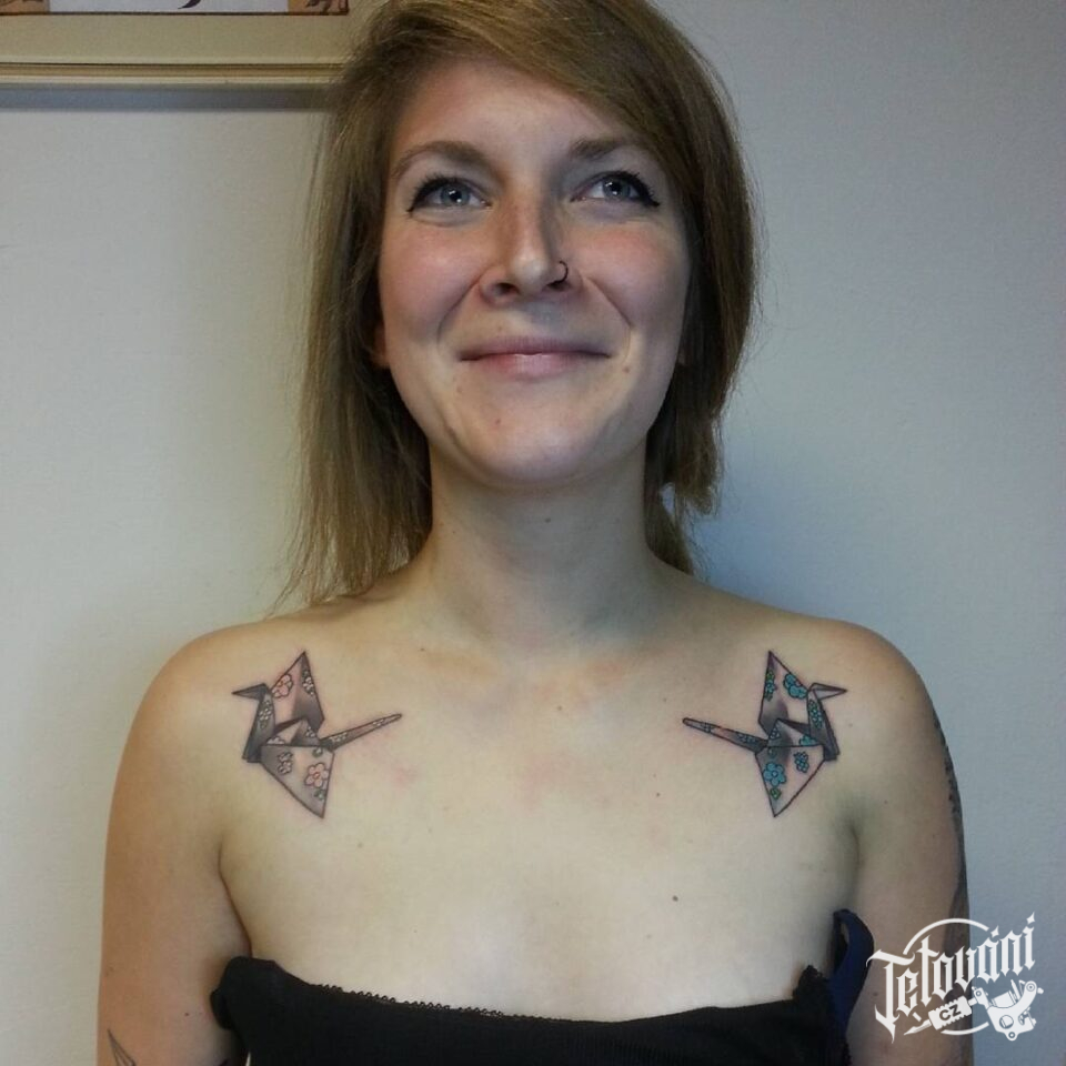 Tetování znaky a symboly, origami s květinami pod klíčníma kostma