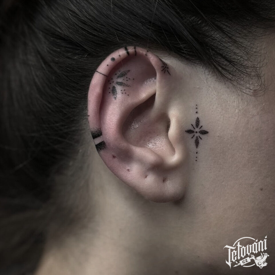 Tetování znaky a symboly, ornamenty, tři tečky na uchu