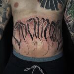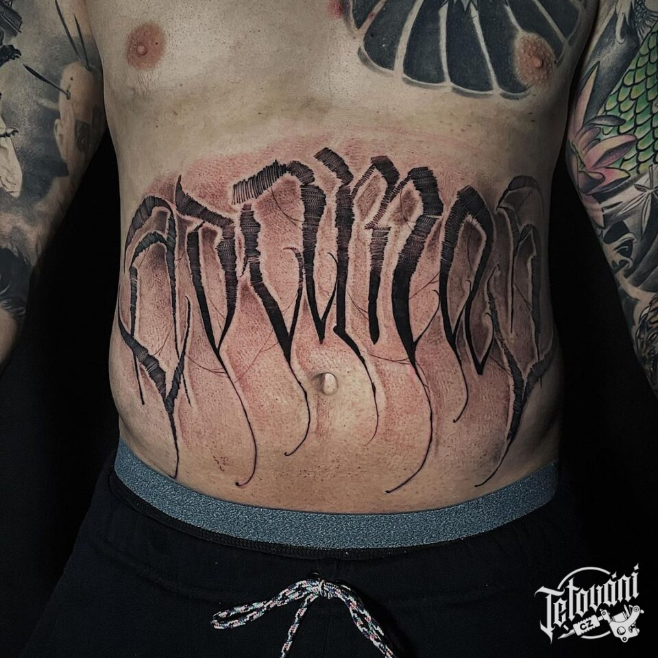 Tetování znaky a symboly, písmena, nápisy na břicho