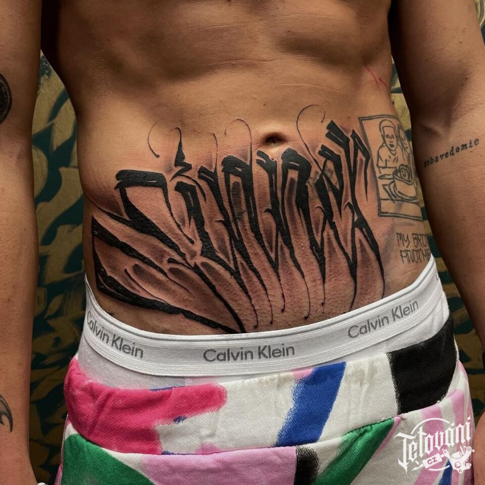 Tetování znaky a symboly, písmena, nápisy na břicho