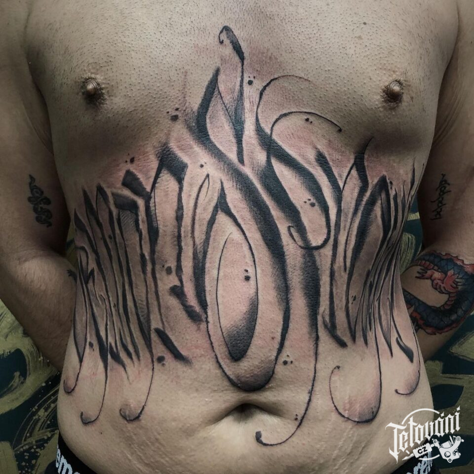 Tetování znaky a symboly, písmena, nápisy na břicho