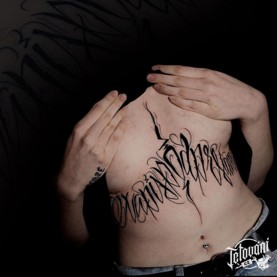Tetování znaky a symboly, písmena, nápisy na hrudník
