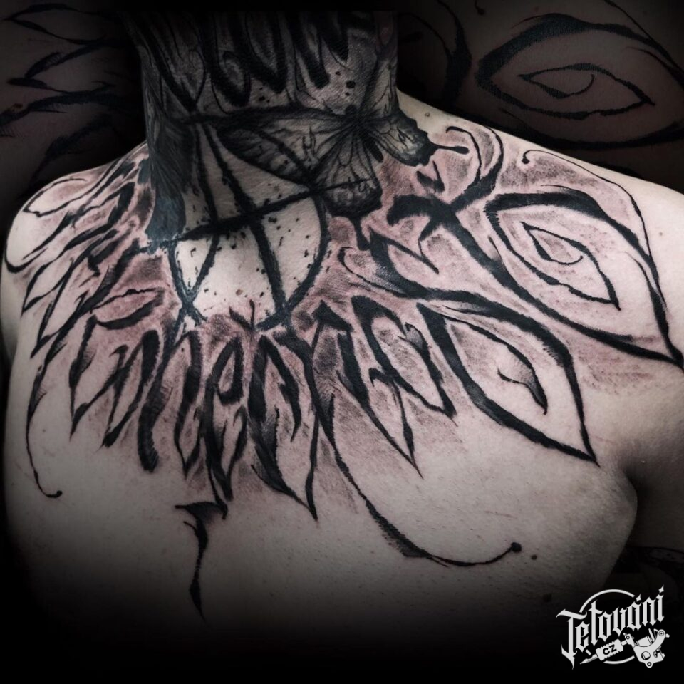 Tetování znaky a symboly, písmena, nápisy na hrudník