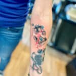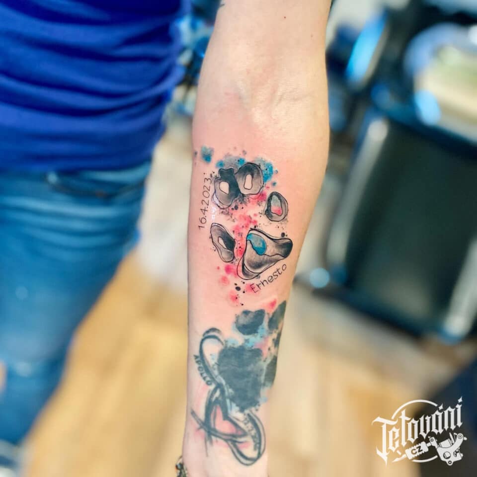 Tetování znaky a symboly psí tlapka se jménem a datumem, vzpomínka na předloktí