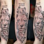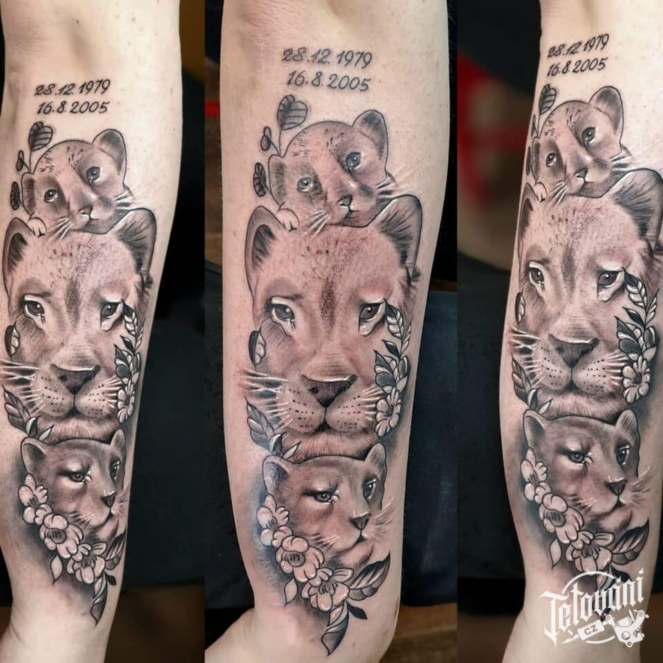 Tetování znaky a symboly rodiny, zvířata lvice a lvíčata na předloktí