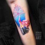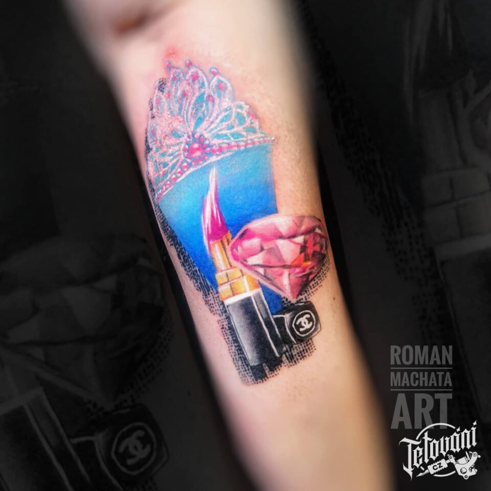 Tetování znaky a symboly, rtěnka, diamant a ornamenty na předloktí