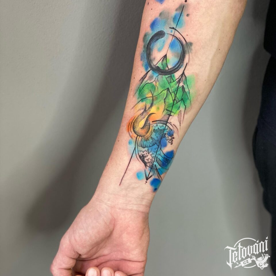 Tetování znaky a symboly, šíp, příroda, hory na předloktí